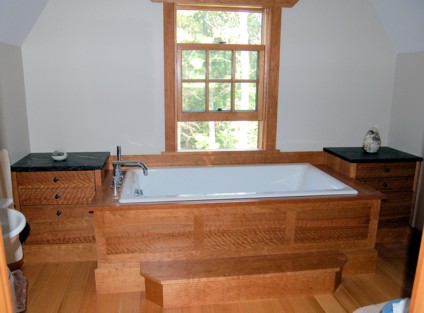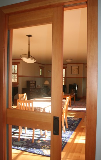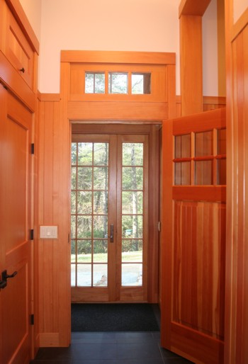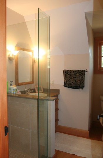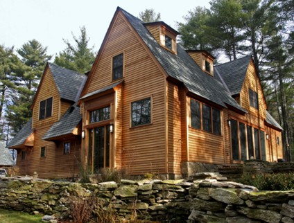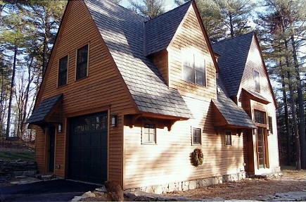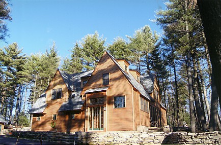 I Approximately 2,200 s.f. of newly constructed home with three bedrooms designed for empty nesters in the mountain forests of Massachusetts. A two-car garage parking court, stone walls and terraces create a small compound nestled into its site. An additional garage parking bay within the house allows for direct access to the home in inclement weather. The house includes living room with piano bay, dining room access to exterior stone terrace, office, laundry/sewing room, and potting/storage area near the garage. The exterior of the house is cedar shingles and clapboard with stone base and asphalt shingle roof. Completed in 2006.