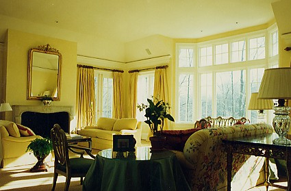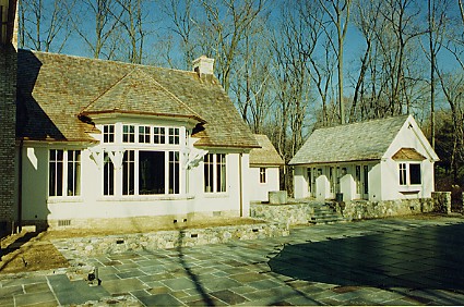 A small courtyard was created by the addition of living room, pool house/office with bath and kitchen, and a small storage building. The courtyard opens out to a new bluestone terraced pool and views to a lake. Since landscaped, the design won a Connecticut landscaping award. |